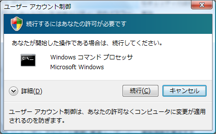 つまり、非署名の実行ファイルであっても、「Windows コマンド プロセッサ / Microsoft Windows」の名を騙って権限を昇格し(この時のダイアログの色は青; 上図参照)、管理者特権を必要とするコードを実行可能である、ということだ。同様に、任意の外部実行ファイルを(親-子の関係で)起動できる署名済みアプリケーションには注意を払う必要があろう。