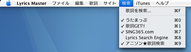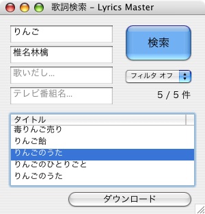 いつも Lyrics Master を作っていて悩むのは、Mac OS X と Windows のフォントサイズの違いです。上の画面を見ると分かるように、Mac OS X ではこのウィンドウサイズで文字が一杯なのですが、Windows ではテキストの占めるウィンドウサイズの割合は半分程度。結局 Mac OS X に合わせることになって、Windows 版の画面はやたらと空白部分が多いマヌケな画面に見えるかも。。。